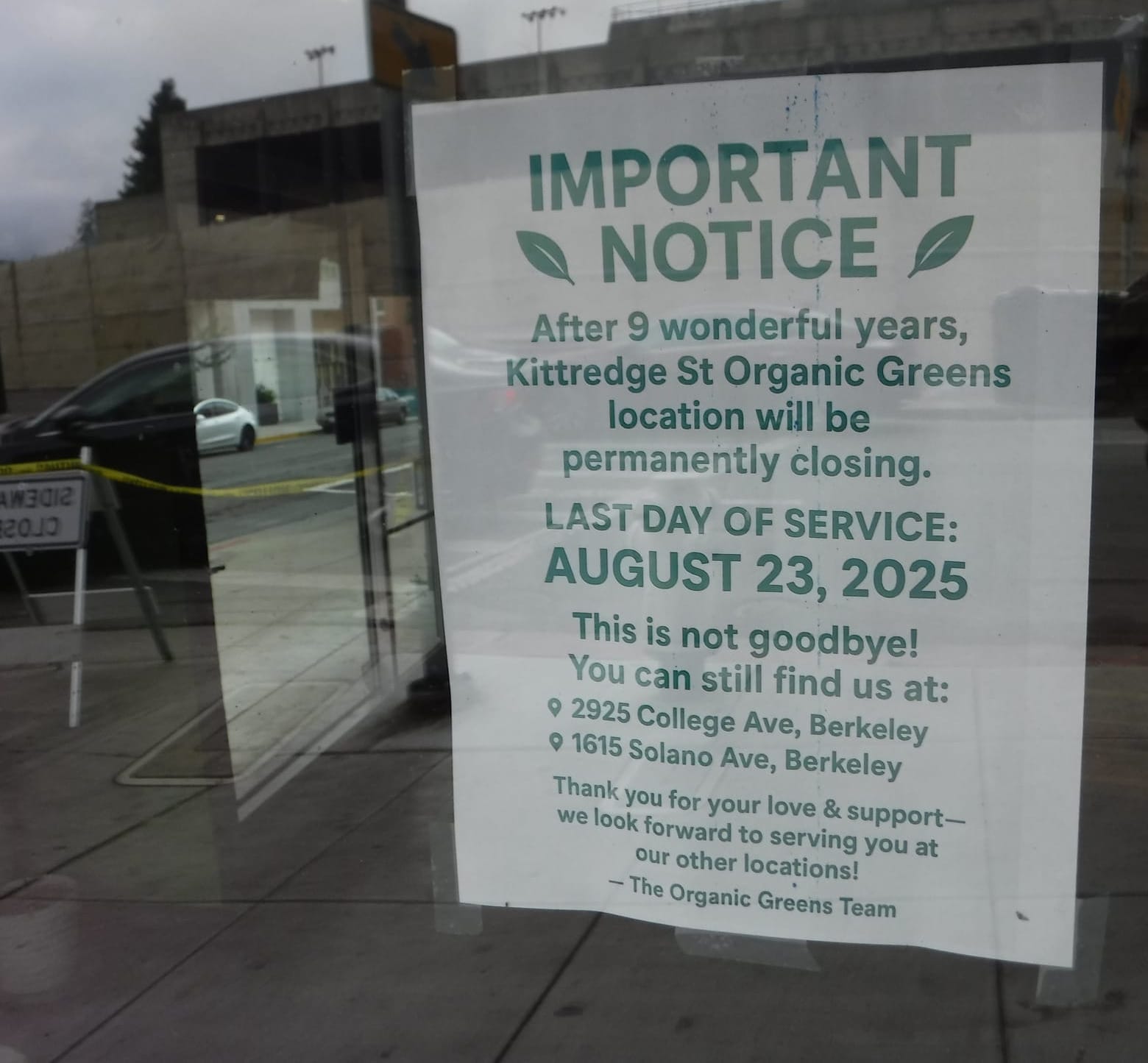 berkeley's other two organic greens locations (on solano avenue and in the elmwood) remain open, but organic greens kittredge at 2177 kittredge street in berkeley has permanently closed.