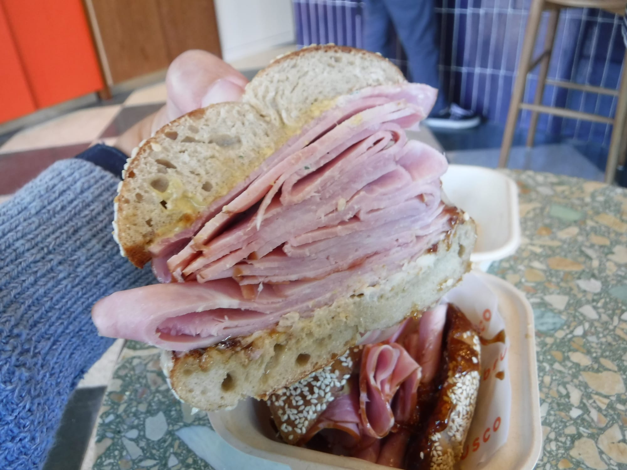 our toasty-brown sesame bagel had good chew and heft – important, given the impressive amount of fra'mani italian ham packed between its hemispheres. also present: just enough of the seasonal sandwich's dominant condiment, a sticky, sweet, delicious fresh fig jam. (pro tip: make ready several napkins.) whipped butter and dijon added balance, creaminess and tang.