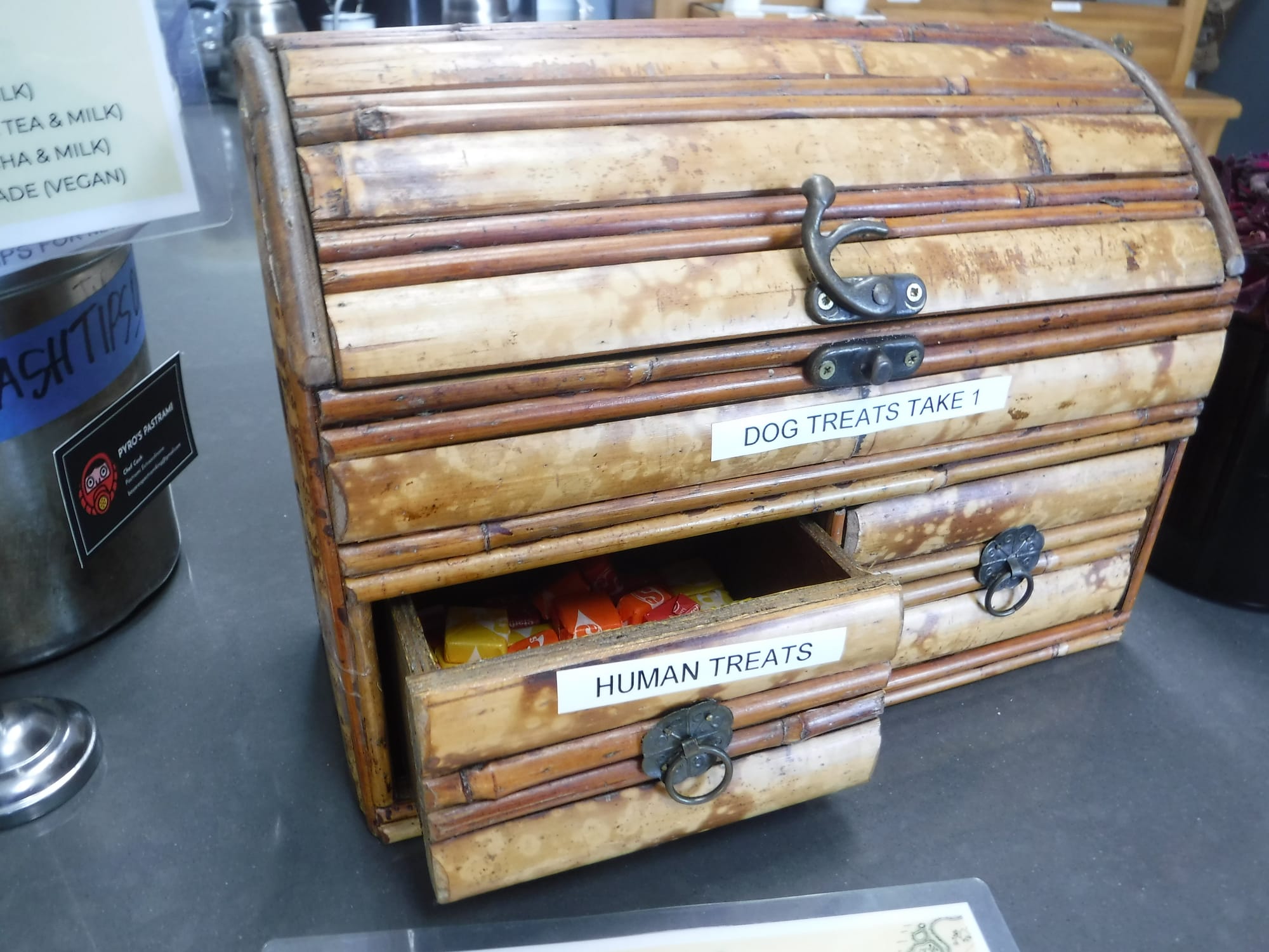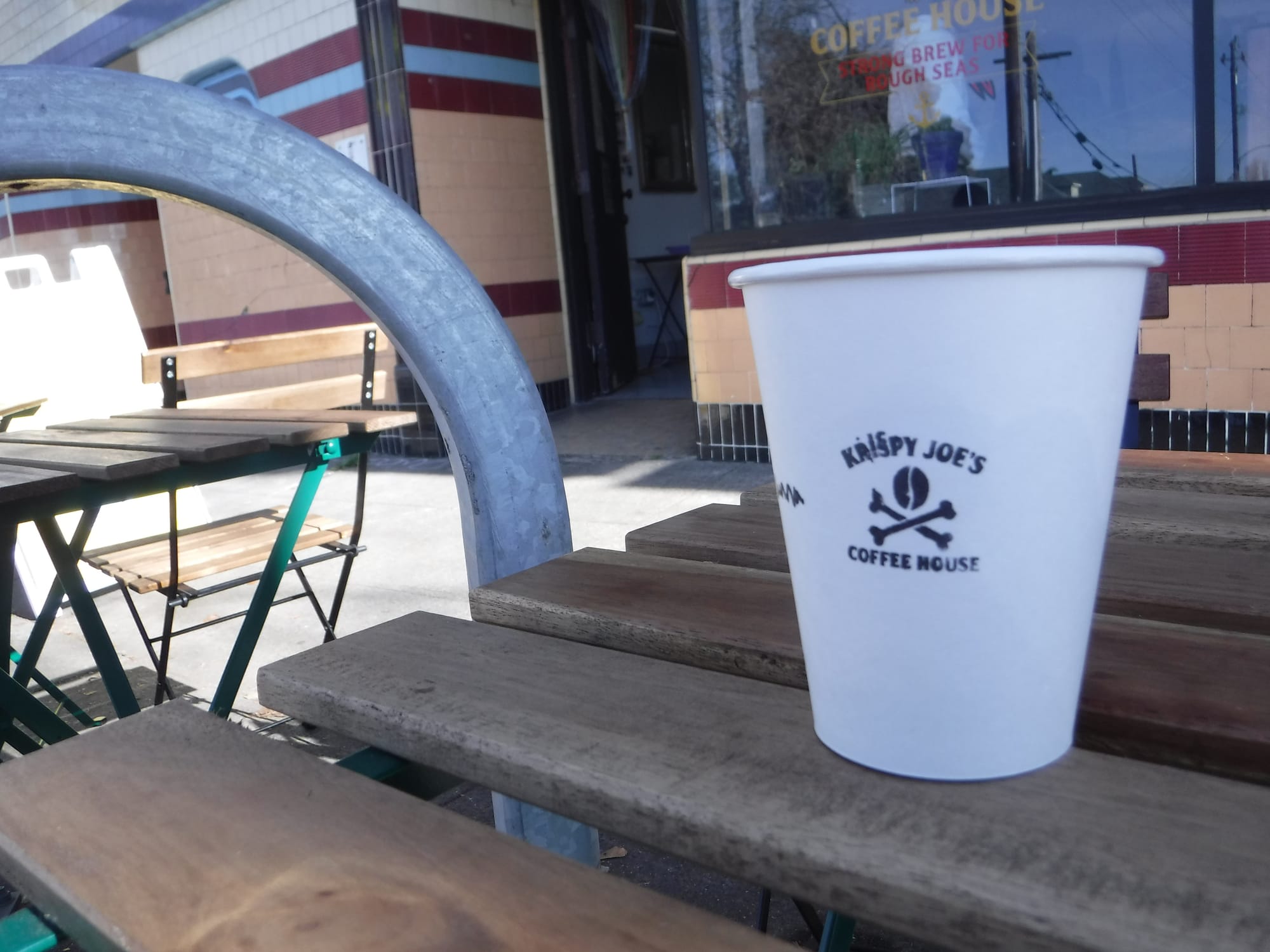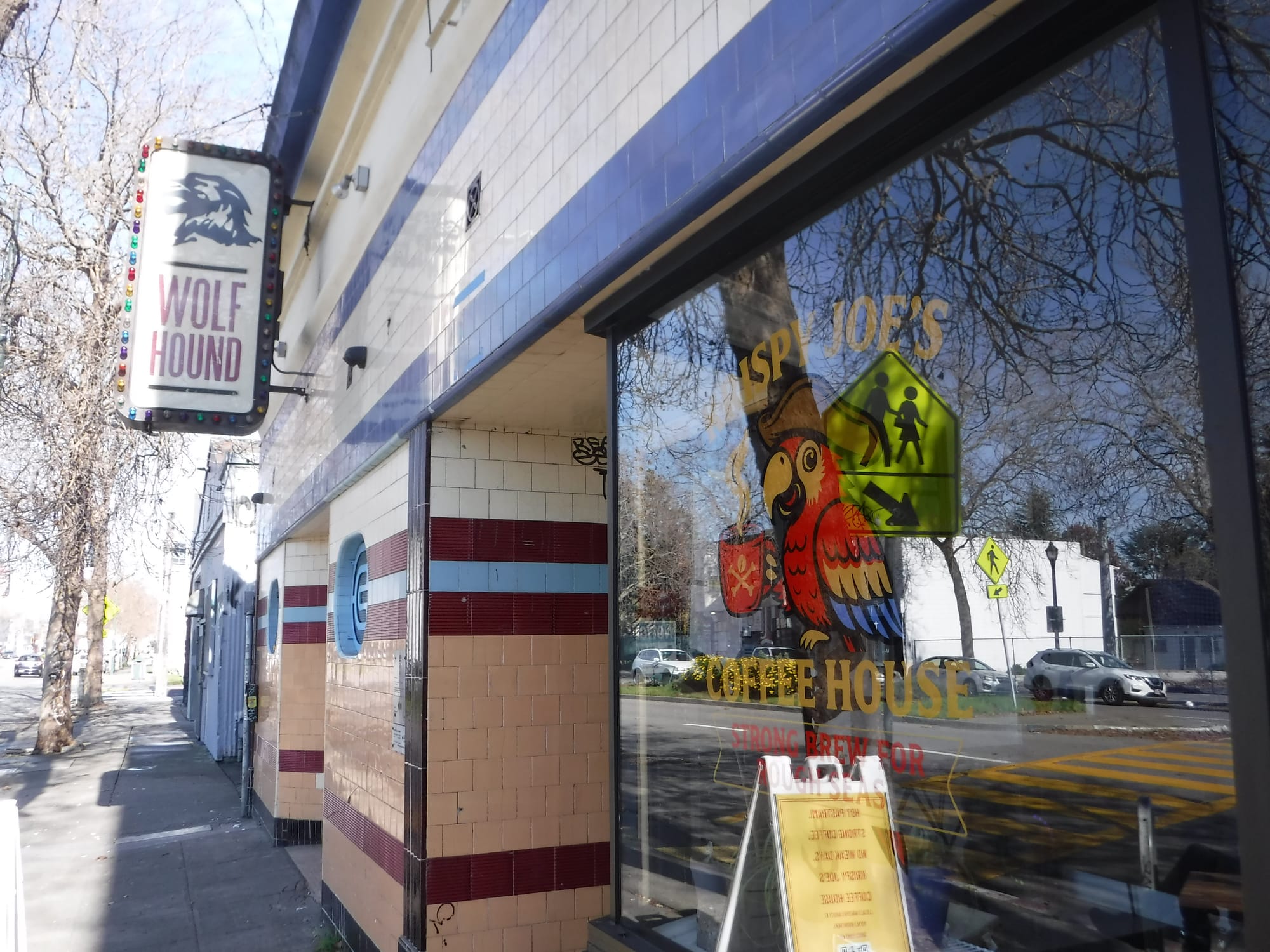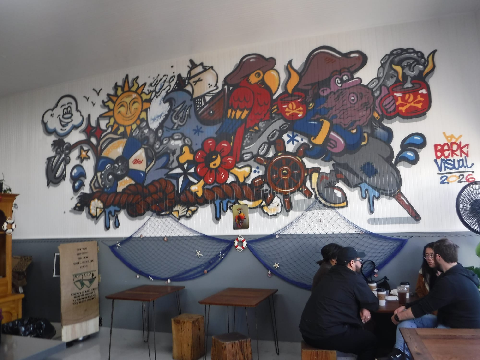 krispy joe's coffee and sandwich shop is outfitted in pirate decor and a colorful mural backdrop from berk visual, and has a small amount of seating inside and out. photo credit berkeley eats.