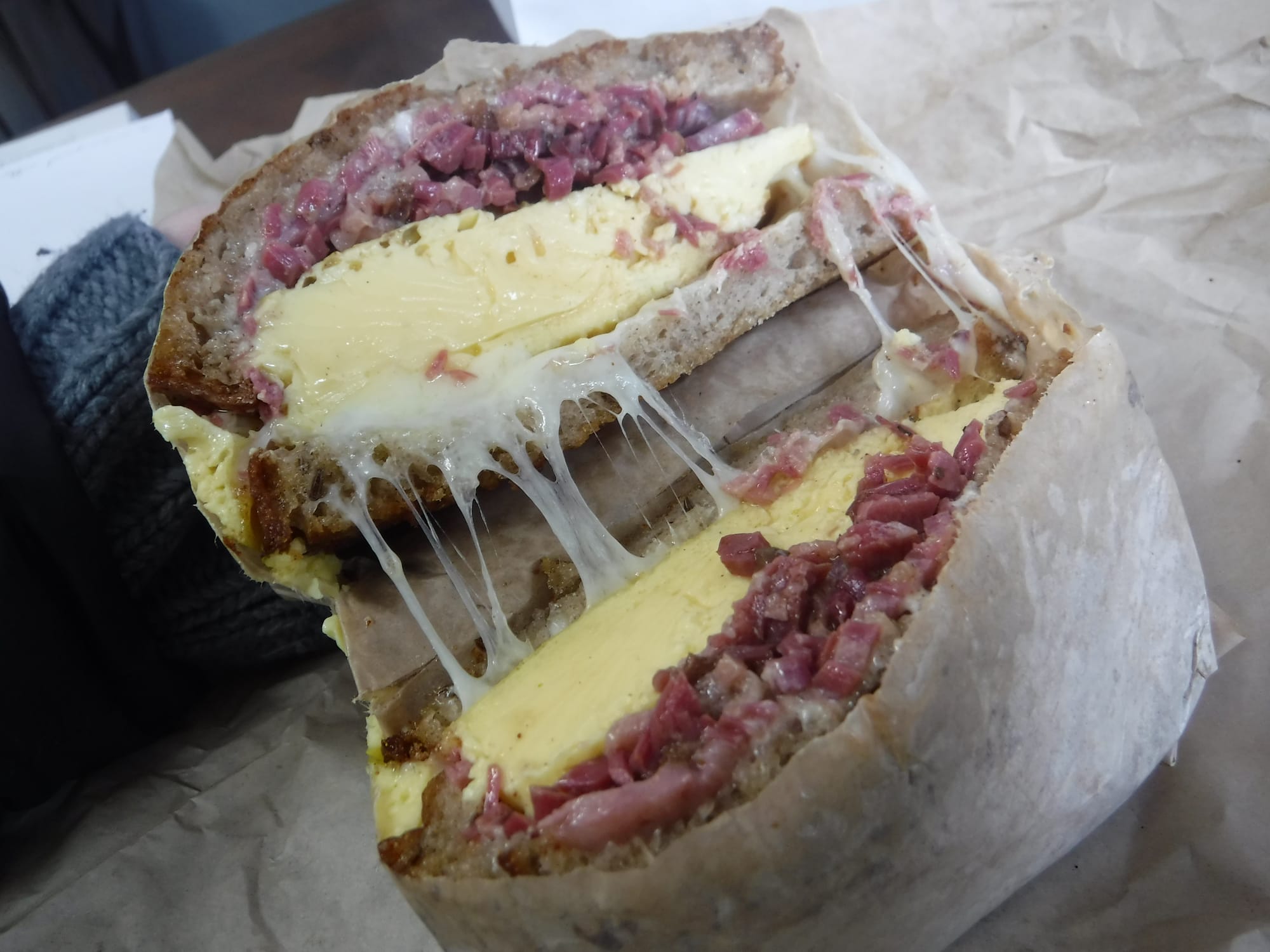 the pec – pastrami, egg and cheese – features tender layers of pastrami, a half-inch of fluffy scrambled egg, and melted swiss cheese, griddled with a hint of mayo for addictive flavor and fat. ours, on an everything boichik bagel, was gone in moments. we tried the same on rye a week later: also good (for us the bagel was the winner). it needs only napkins. and maybe a cup of strong coffee.