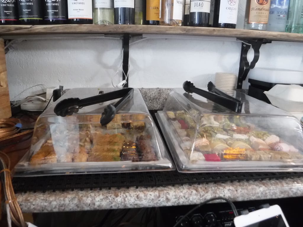 a nourishing wrap large enough for two people (or two meals), a selection of dessert bites, and signage at berkeley's middle east cafe. photo credit berkeley eats.