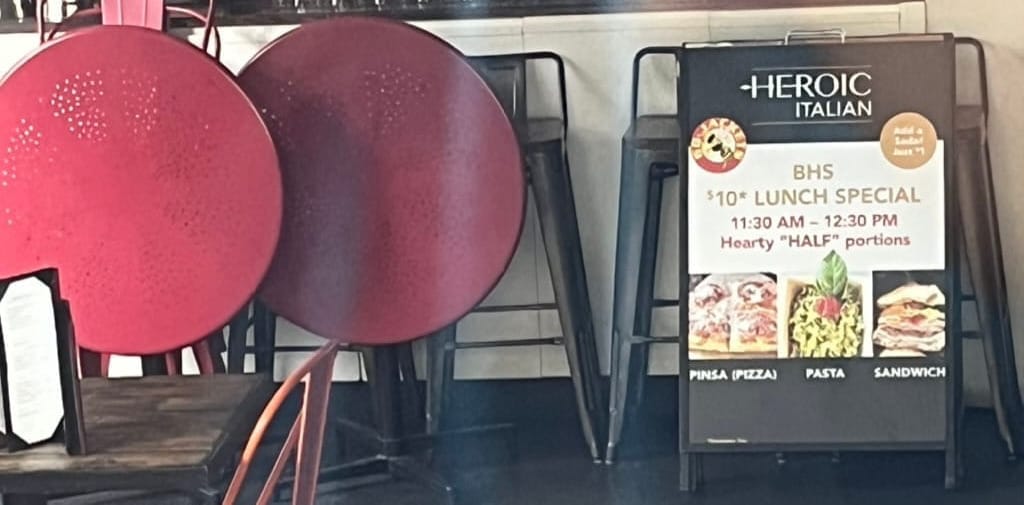psst..from 11:30am-12:30pm, berkeley high school students and staff can eat lunch at heroic italian near campus for only $10.