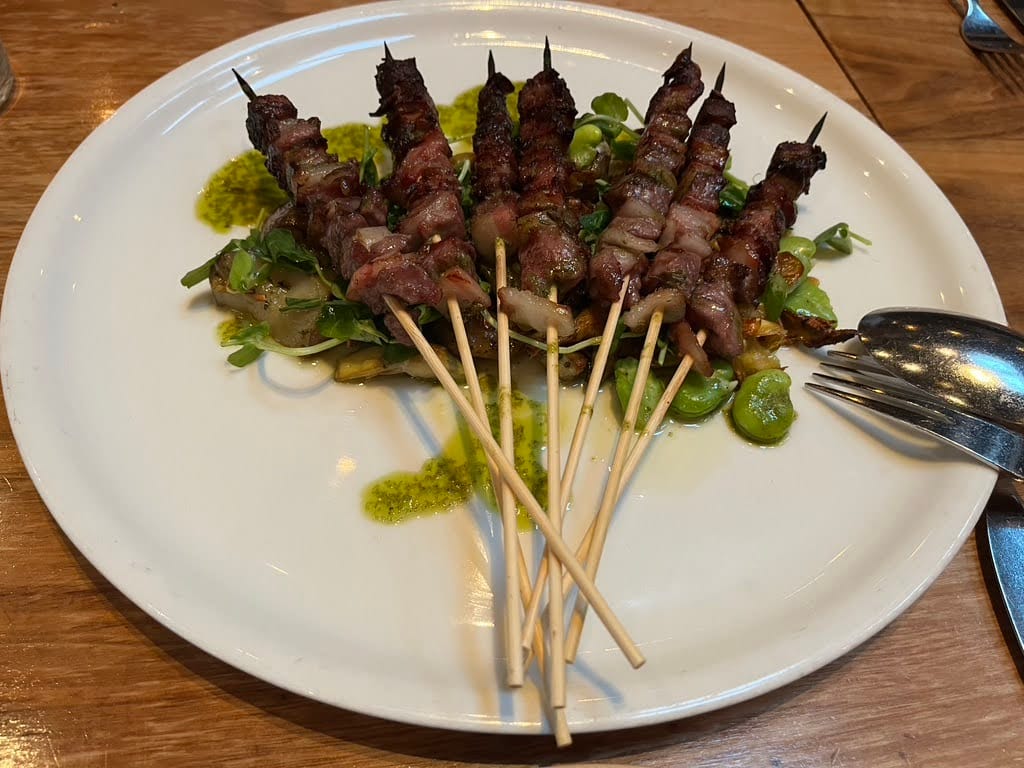 on a sea-colored plate, a tender, pan-seared branzino fillet came draped over a buttery bed of gnocchi alla romana, served with summer squashes and a light, intense vegetable flan. skewers of boneless lamb arrosticini were served on a colorful pile of garlicky roasted sunchokes, tiny, baby castroville artichokes, fava beans and mint. (to be honest, we wanted a meatier portion of lamb here, but only to match the tangy heft of the early summer vegetables.)