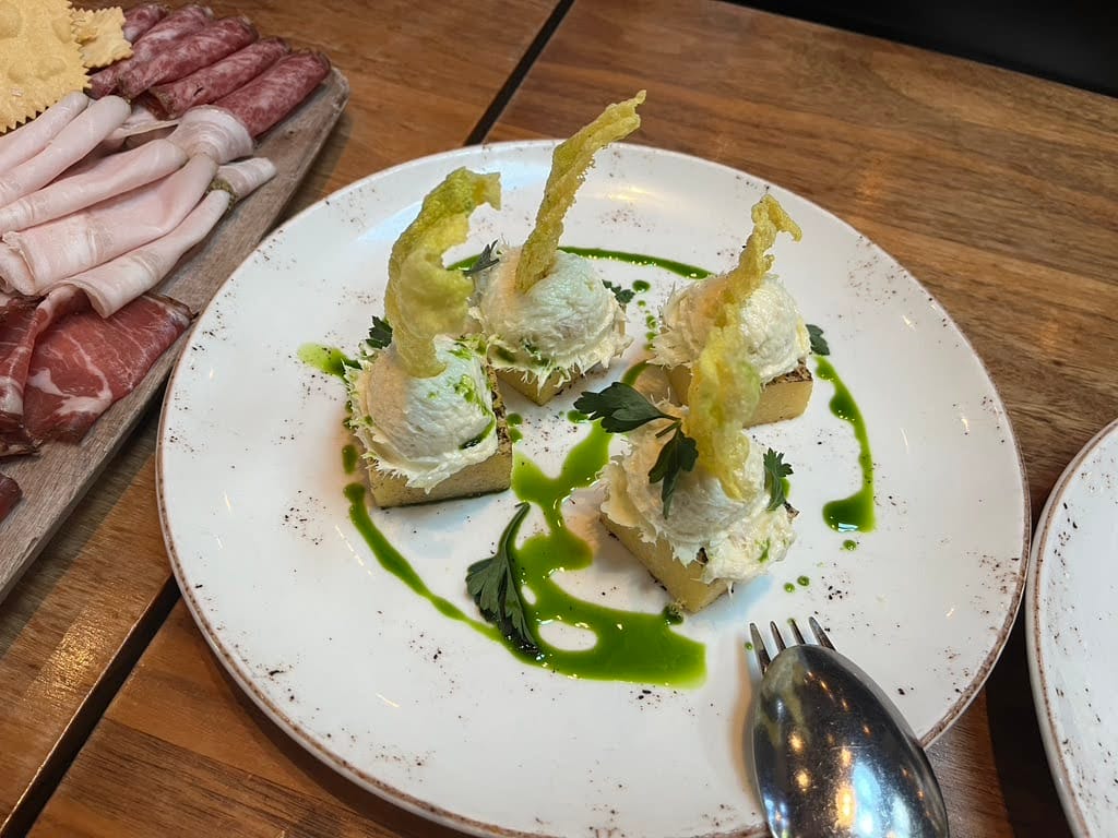 for dinner, we chose a mix of cured, fried and fresh appetizers to start, beginning with a rainbow of silken house-cured salumi – pancetta affumicata, winning bresaola, spicy coppa, porchetta and salame rustico – with housemade crackers, pickled vegetables, olives and mustard.