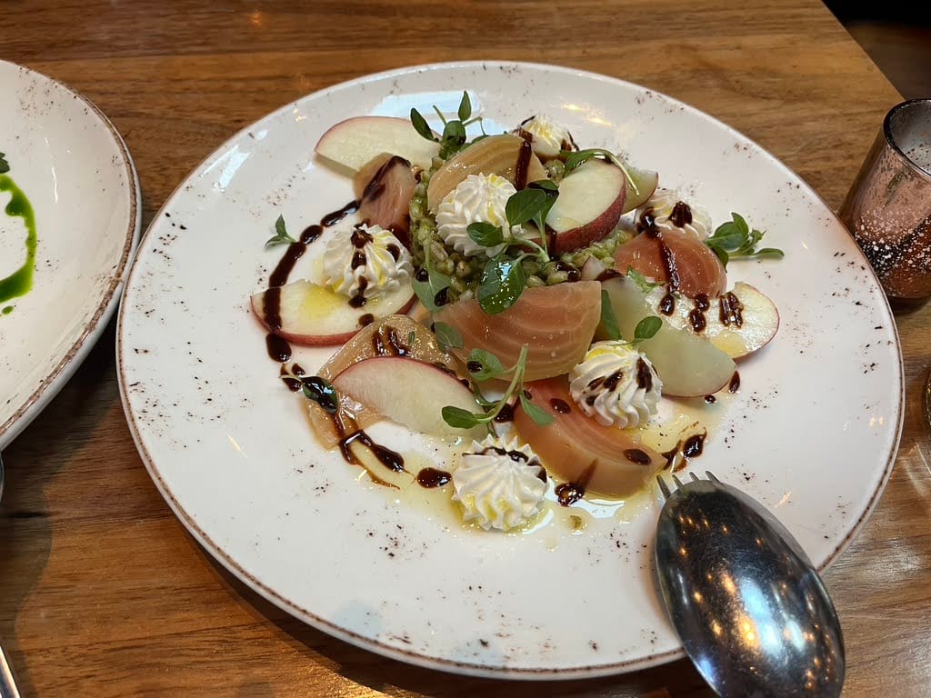 we recommend any dish with the show-stealing housemade ricotta, so fresh and creamy, or preparations of traditional italian grains and starches – farro, polenta, semolina. the ricotta and farro salad showcased both, paired with herbs, chioggia beets, white nectarines, mint, fig reduction – early summer on a plate.