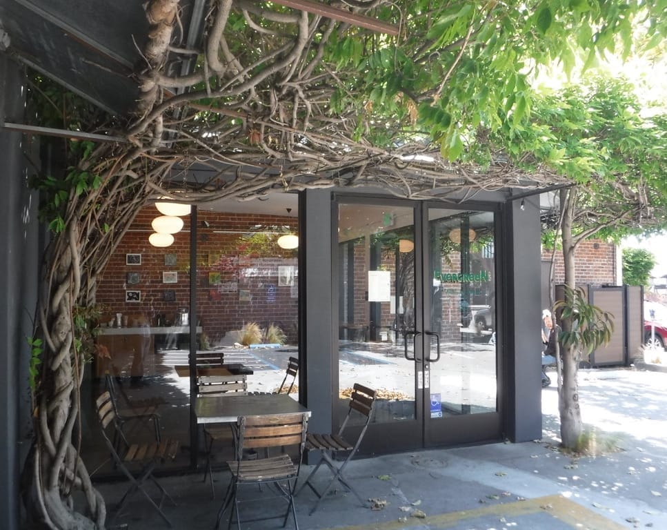 a quiet outdoor cafe table under the arbor at berkeley's evergreen cafe . photo credit berkeley eats . middle east cafe