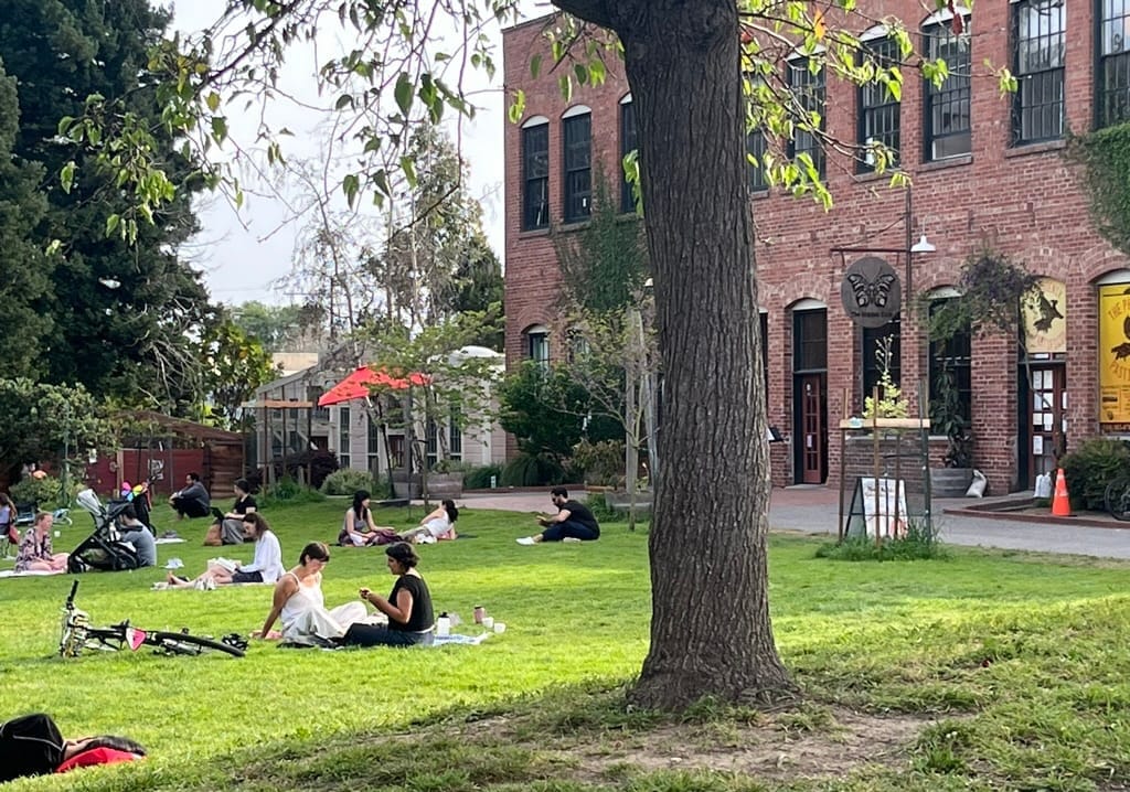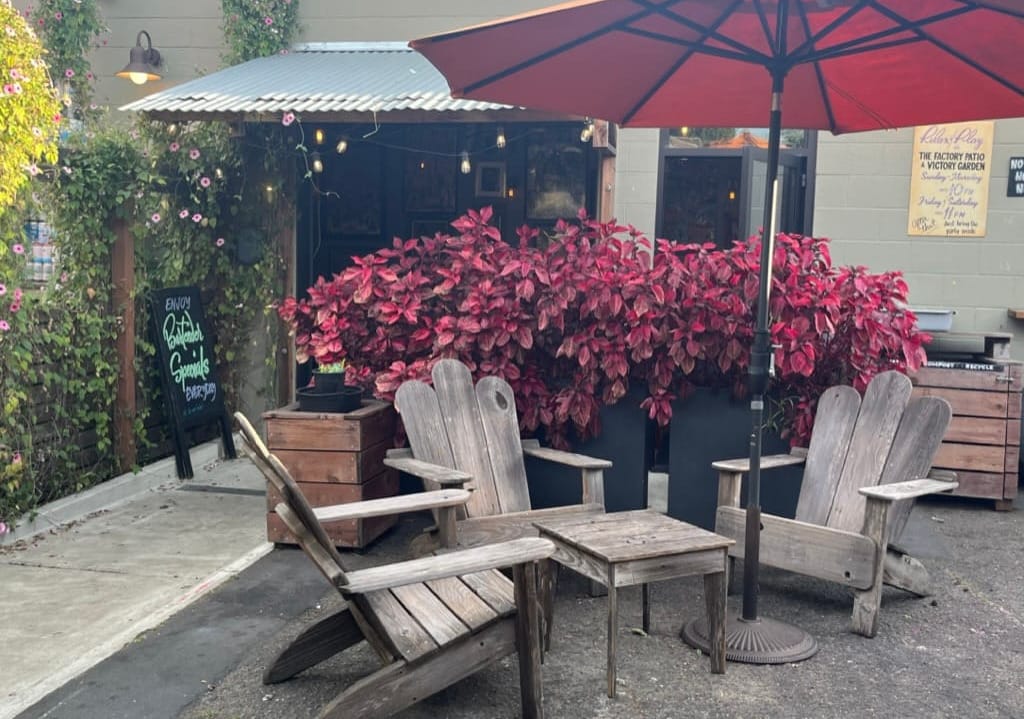 the factory bar in richmond features a large outdoor patio with clusters of relaxed seating tucked around a victory garden. photo credit berkeley eats . oakland acre