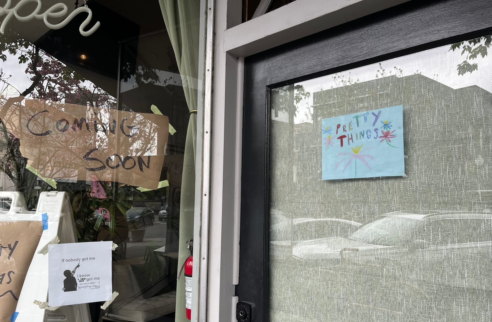 homemade signs mark new craft beer bar pretty things in albany; stools re-appropriated from the former good hop in oakland. photo credit berkeley eats.