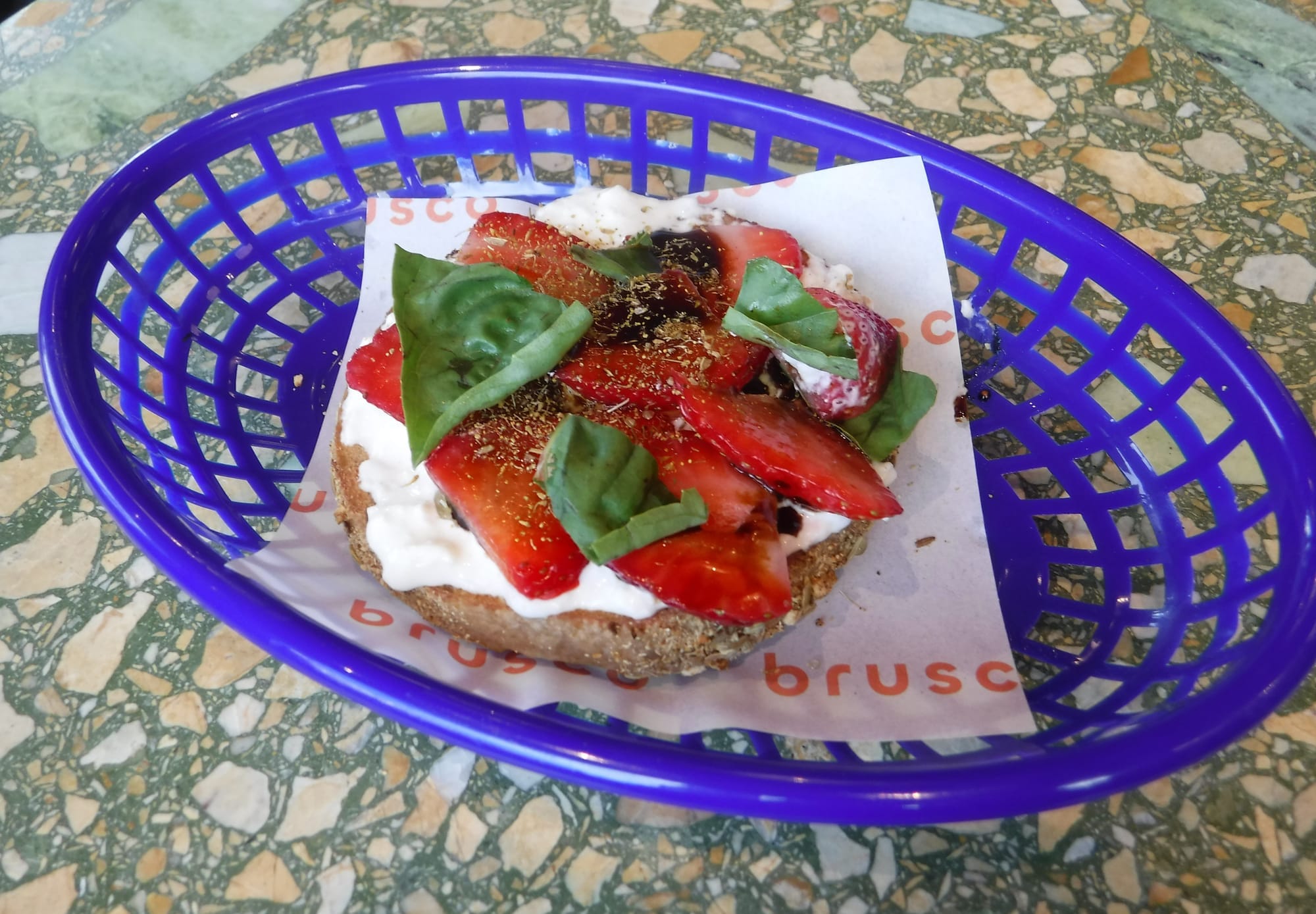 cafe brusco, 2000 university avenue, berkeley - strawberries, burrata, basil, fennel pollen, aged balsamic, olive oil and sea salt on an open-faced bagel.
